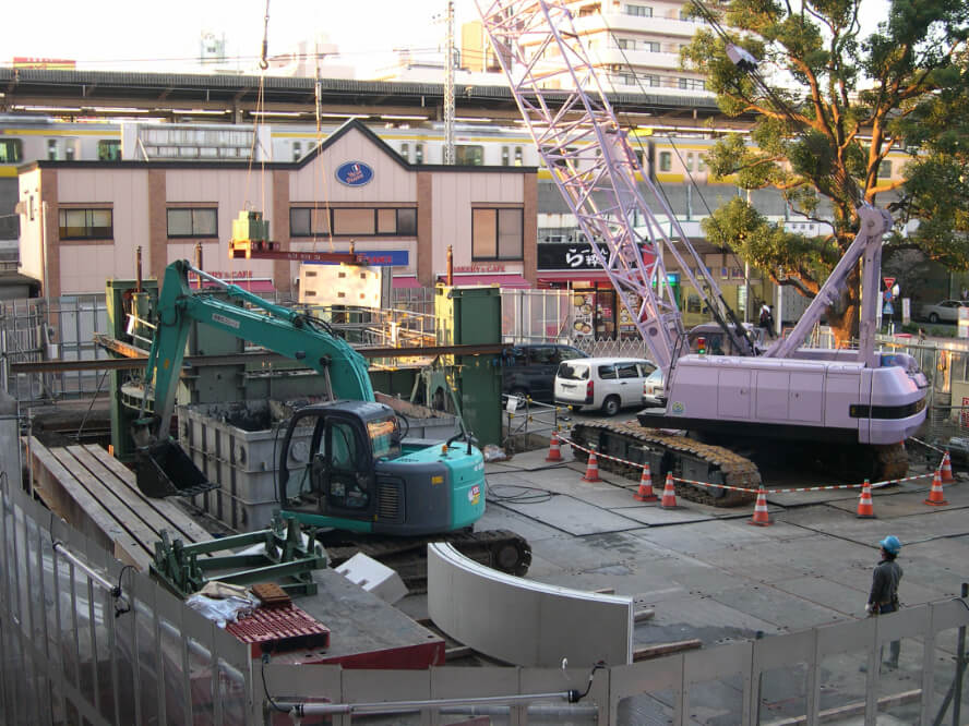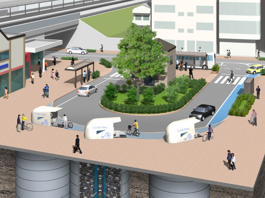 様々な人が集まる駅前広場や、その周辺の歩道などに放置された自転車は、通行の妨げになるだけでなく緊急時の交通障害になるなど、社会問題になっている。その対策として駅周辺への新たな駐輪場の整備が挙げられるが、駅周辺などの市街地では必要な規模の土地を確保するのが困難であり、地下空間を利用した機械式駐輪場のニーズが高まっている。駅周辺での施工は、鉄道近接・狭隘な施工ヤードなどの制約が多いが、アーバンリング工法を採用することで安全・確実・スピーディーに地下機械式駐輪場を建設することができた。