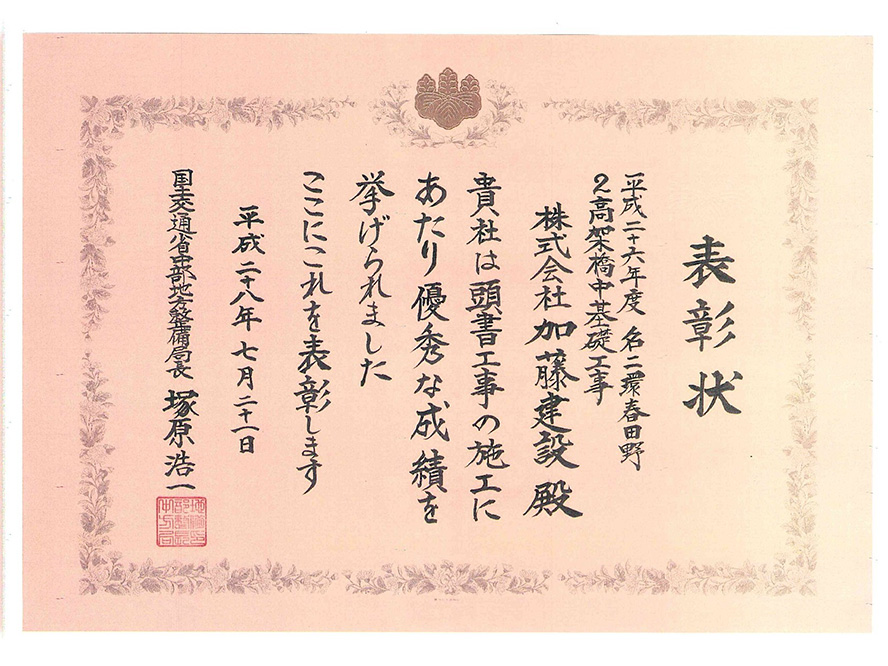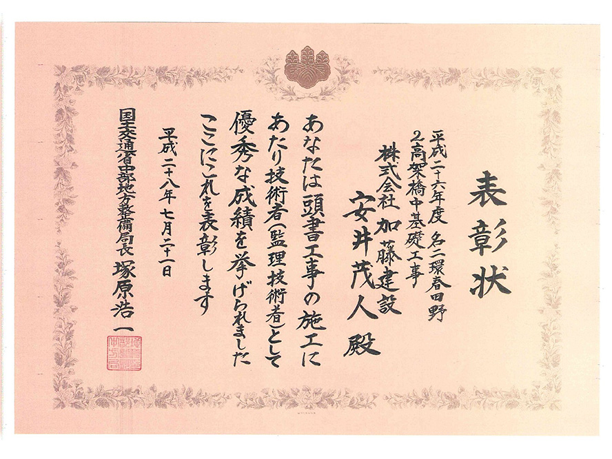 施工事例 橋梁工事一覧 橋梁その9 施工事例 EXAMPLES 橋梁平成26年度 名二環春田野2高架橋中基礎工事 DATA 工事名 平成26年度 名二環春田野2高架橋中基礎工事 施工年 2015年11月 発注者 国土交通省 中部地方整備局 愛知国道事務所 工事場所 愛知県 名古屋市 表彰 優良工事 技術者 環境 環境提案書、植生調査、地域祭り参加