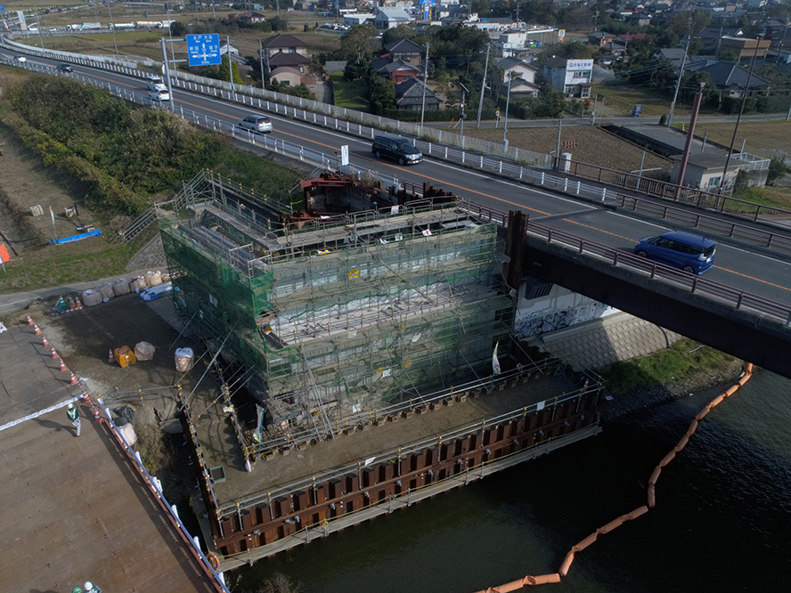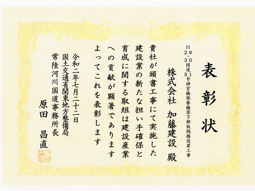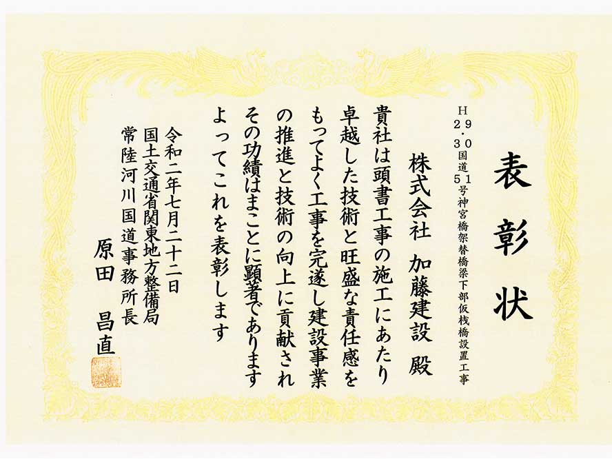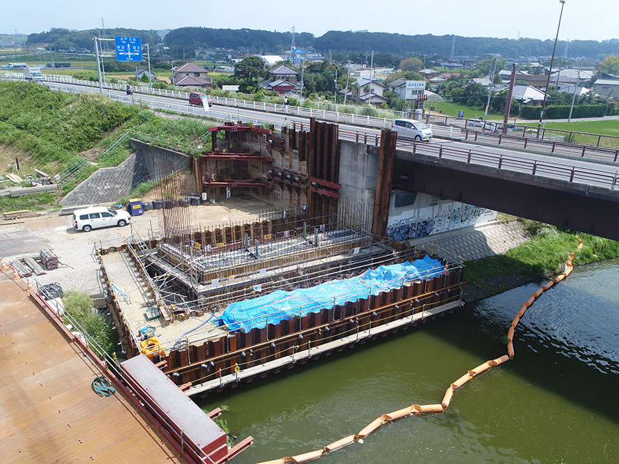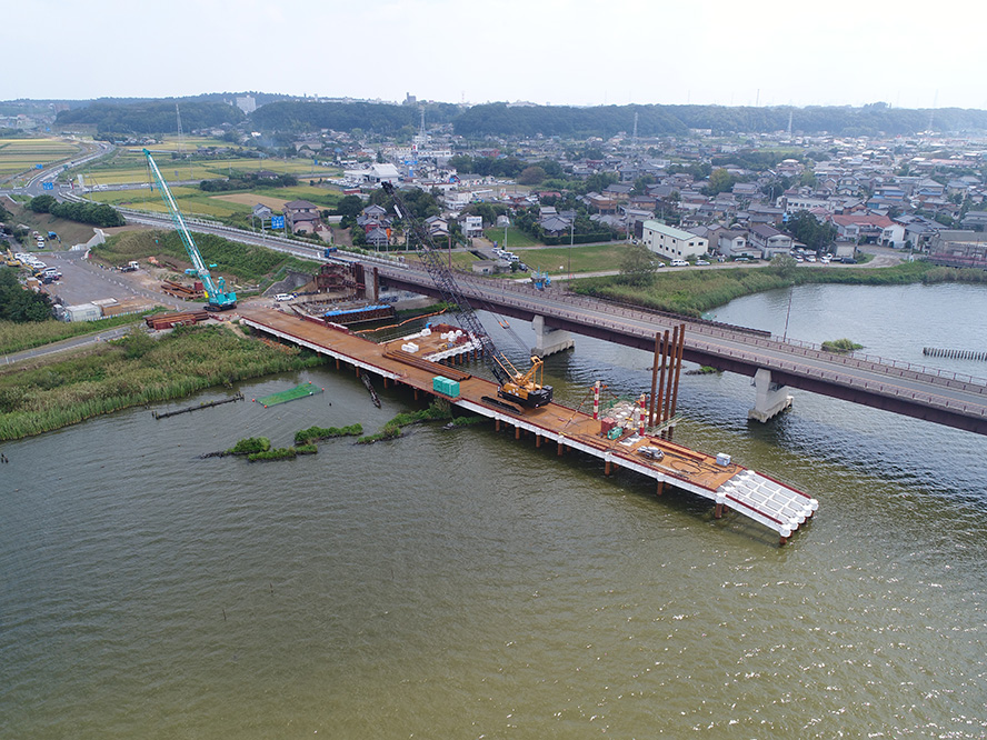施工事例 橋梁工事一覧 橋梁その20 施工事例 EXAMPLES 橋梁H29・30国道51号神宮橋架替橋梁下部仮桟橋設置工事 DATA 工事名 H29・30国道51号神宮橋架替橋梁下部仮桟橋設置工事 施工年 2019年 4月 発注者 国土交通省 関東地方整備局 常陸河川国道事務所 工事場所 茨城県 鹿嶋市 環境(エコ活動) 環境提案書、植生調査報告書、水生生物保護、アサザ(希少植物)保護 表彰 優良工事 建設産業担い手確保・育成貢献工事