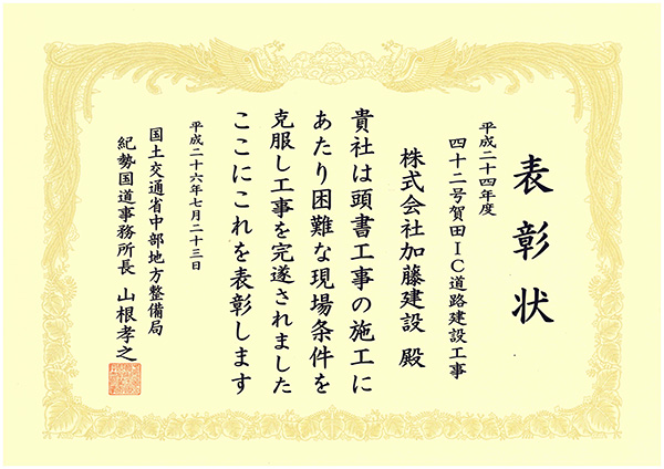 施工事例 道路改良工事一覧 道路改良その3 施工事例 EXAMPLES 道路改良平成24年度 42号賀田IC道路建設工事 DATA 工事名 平成24年度 42号賀田IC道路建設工事 施工年 2013年12月 発注者 国土交通省 中部地方整備局 紀勢国道事務所 工事場所 三重県 尾鷲市 表彰 優良工事 環境 環境提案書