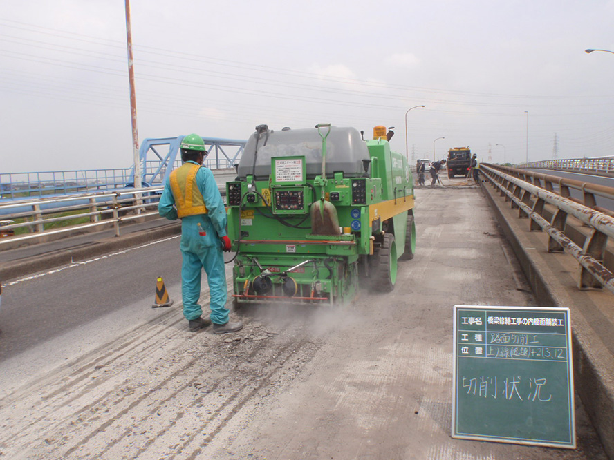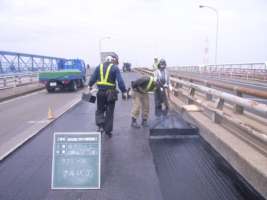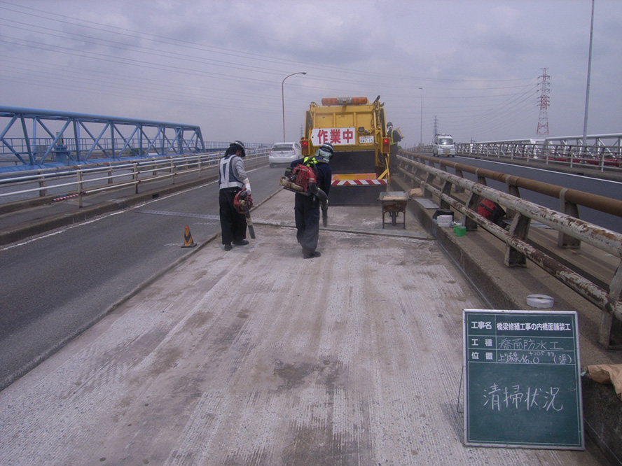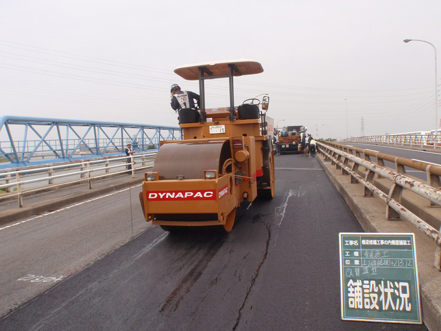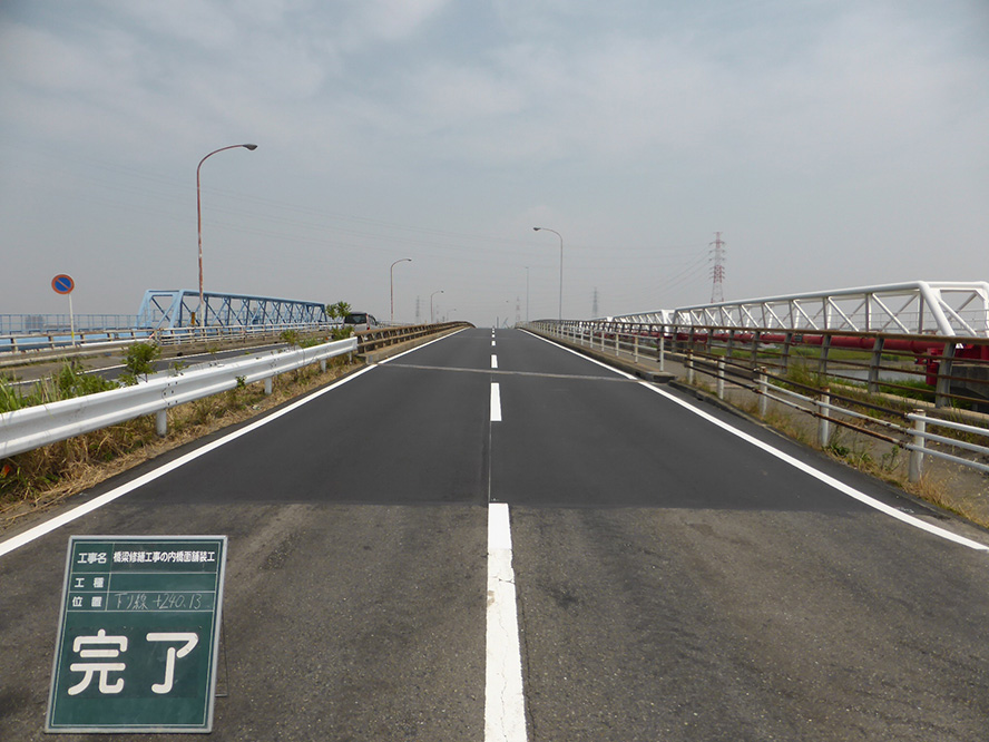 施工事例 舗装工事一覧 舗装その3 施工事例 EXAMPLES 舗装橋梁修繕工事の内 橋面舗装工 DATA 工事名 橋梁修繕工事の内 橋面舗装工 施工年 2014年7月 発注者 愛知県 海部建設事務所 工事場所 愛知県 海部郡蟹江町