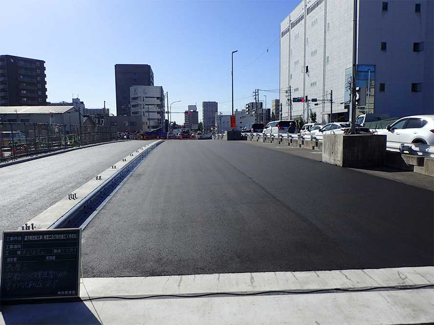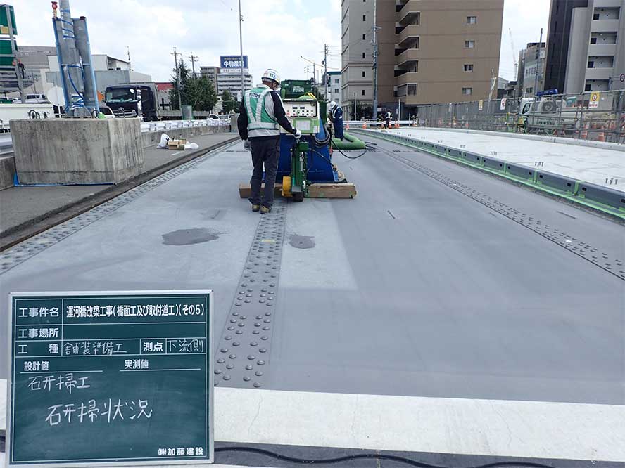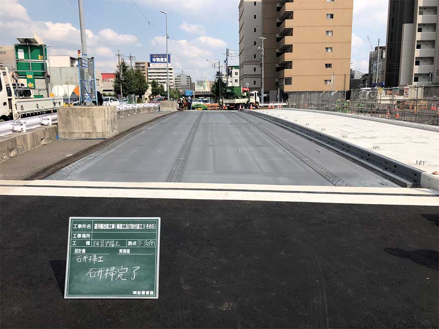 施工事例 舗装工事一覧 舗装その18 施工事例 EXAMPLES 舗装運河橋改築工事(橋面工及び取付道工)(その5) DATA 工事名 運河橋改築工事(橋面工及び取付道工)(その5) 施工年 2021年 2月 発注者 名古屋市 工事場所 愛知県 名古屋市 環境 植生調査、水生生物調査、環境掲示板