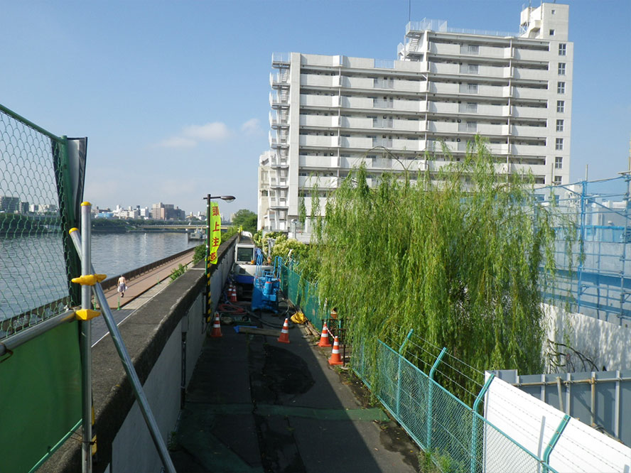 施工事例 護岸・堤防補強工事一覧 護岸・堤防補強その3 施工事例 EXAMPLES 護岸・堤防補強隅田川(白鬚橋下流)右岸防潮堤耐震補強工事 DATA 工事名 隅田川(白鬚橋下流)右岸防潮堤耐震補強工事 施工年 2015年12月 発注者 東京都 江東治水事務所 工事場所 東京都 台東区