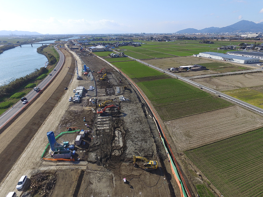 施工事例 盛土の安定対策一覧 盛土の安定対策その2 施工事例 EXAMPLES 盛土の安定対策平成28年度災害復旧緑川下仲間下流地区外堤防復旧工事 DATA 工事名 平成28年度災害復旧緑川下仲間下流地区外堤防復旧工事 改良深度 3.2~4.2m 工事場所 熊本県上益城郡嘉島町