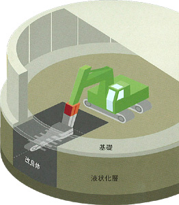 旧法タンクの設計手法見直しなどの理由から、臨海部の既存構造物の液状化対策が重要な課題となっている。最も信頼性の高い方法は、液状化層そのものを地盤改良する方法である。従来の既設構造物直下を地盤改良する工法としては、構造物直下の機械施工が困難であるなどの理由から、特殊シリカ系の薬剤を浸透固化する以外に有効な方法がなかった。 しかしながら、この方法は機械撹拌による地盤改良工法と比べ、改良コストが高い、改良範囲の信頼性に乏しいなどの欠点があった。 そこで本工事では、パワーブレンダー工法の鉛直撹拌+水平撹拌を用いて、既設構造物直下の地盤改良を機械撹拌方式で実施することで、信頼性の高い地盤改良をコストを抑え実施することができた。