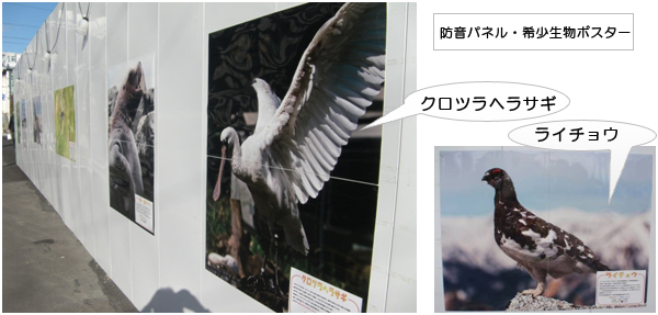 ☆仮囲いには防音パネルを使用し、装飾として希少生物の写真と解説を掲示しました。2010年はCOP10が開催され生物多様性が注目されています。道行く人々に生物環境について少しでも興味を持っていただけたらと希少生物ポスターを選びました。