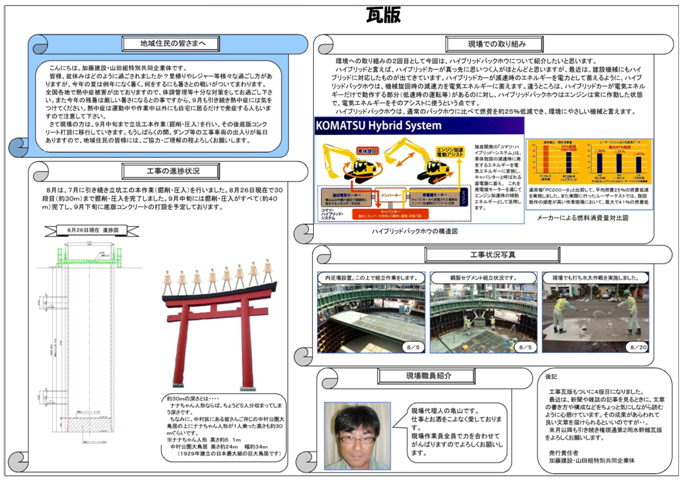 そうした住民の方々への不安や不満感を少しでも解消して頂けたらと思い情報提供の手段として毎月1回「瓦版」というものを現場から発信させました。2回目の発信のころには次号が待ち遠しいという意見も耳に入ってきて月1回のペースで作るのはかなり大変でしたがその後住民の方々とコミュニケーショがうまくとれて本当によかったと思っています。