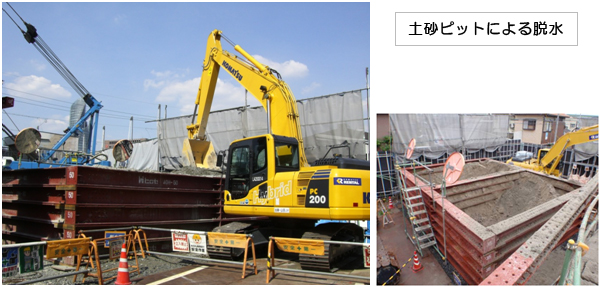 ☆残土処理場を水槽から透水性の土砂ピット(400H山留材使用)に替えることにより、脱水効果を促進しました。水分を抜き残土量を減少することでダンプの運搬回数を減らし、運搬車から出る排気ガスを低減しました。