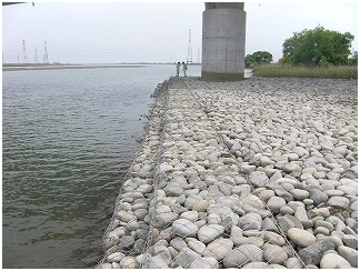 そして撤去した玉石はというと、篭に入れて護岸に設置しました。