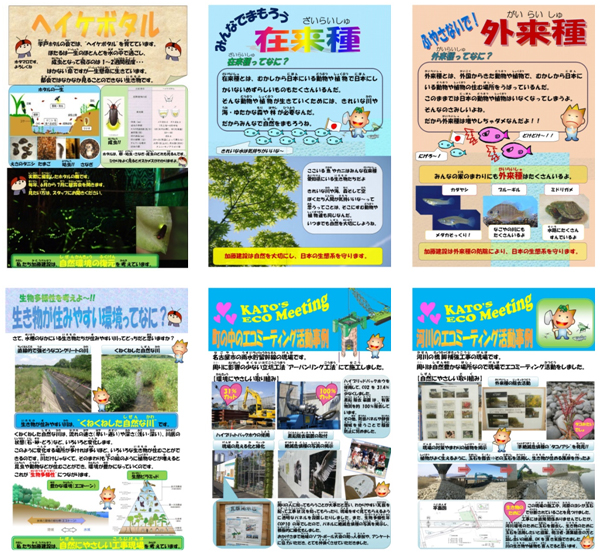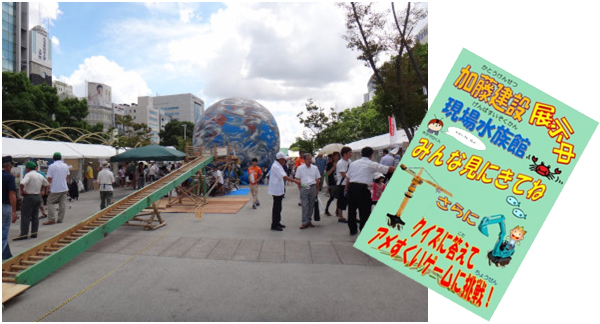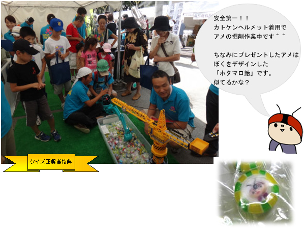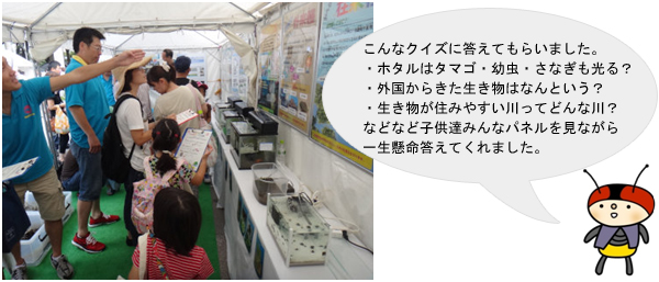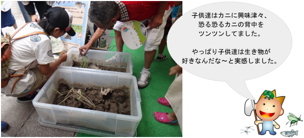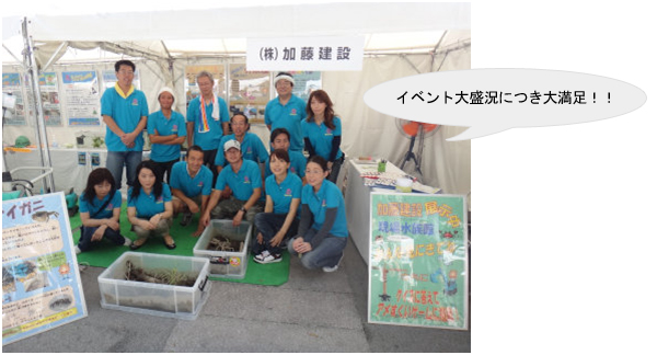 そして私達、加藤建設のブースはというと「建設業における環境との調和」を メインテーマにかかげ、生態系・ホタル・エコミーティング活動についての パネル展示、現場周辺でつかまえた魚や蟹の展示を行い、子供に対しては クイズやアメすくいゲームを行いました。
