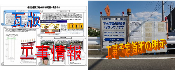 まず地域住民の方に工事内容や工事予定、道路規制場所などを知ってもらう為に、瓦版の配布や工事看板でのお知らせが有効ではないでしょうか。