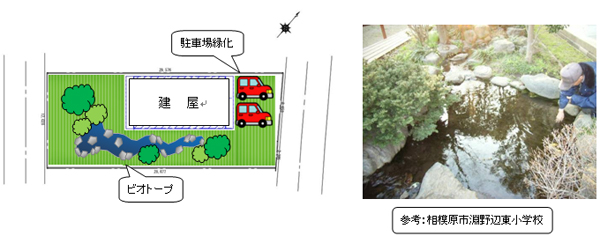 駐車場の一部をビオトープとすることで、生態系の保護、景観の向上、環境意識の向上、企業PRに繋がり、また社員のみなさんの憩いの場としての利用もできます。