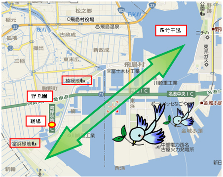 この周辺には、弥富野鳥園や富浜緑地、楠緑地、少し行くとラムサール条約湿地である藤前干潟があります。