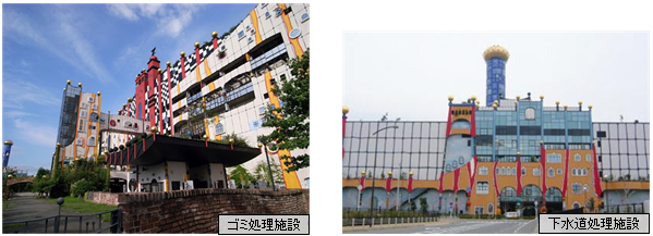今までの下水道処理施設というイメージを変えるものが大阪にあります。この二つの写真はゴミ処理施設と下水汚泥処理施設です。オーストリアの画家・建築家の故フンデルトヴァッサー氏デザインで遺作となった作品だそうです。