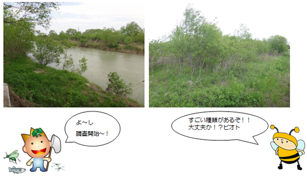 この現場では堤防工事の際、河川内の植物を伐採しますので、植物に特定外来生物や希少種がいないか確認してから伐採を行うことにしました。