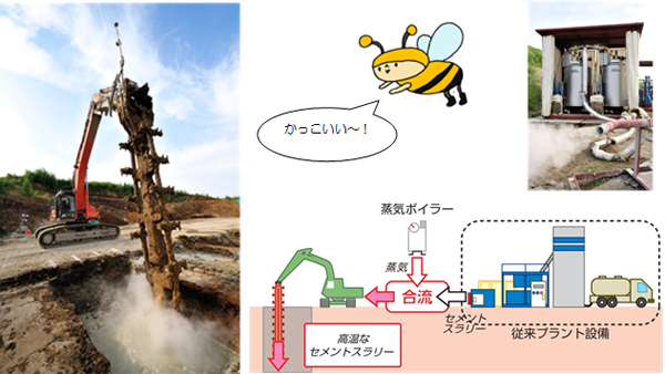 ヒートソイル工法は固化材料に熱を加えることで使用量を低減しCO2を削減し、また早期の強度発現が期待できるため、工期の短縮にもつながります。