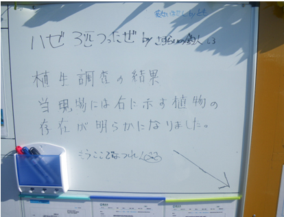 | 早速ハゼ3匹という釣果が書かれています。 このあたりは結構釣り人がいるそうで、継続して利用してもらえるといいですね。 その他にも、 1)工事の内容 2)川の情報 3)特定外来生物について 4)植生調査の結果 などなど・・・、いろいろな情報を掲示しております。 ちなみに、植生調査をしたところ植物を21種類確認したのですが 特定外来生物は発見されませんでしたよ。 |