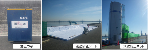 その他にも、油止め蔵という流出油の緊急対策セットと洗浄水流出防止シートと飛散防止ネット。