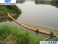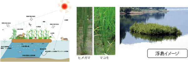 ・オイルフェンス+植生浮島の設置(下部にはひも状ろ材による浄化)