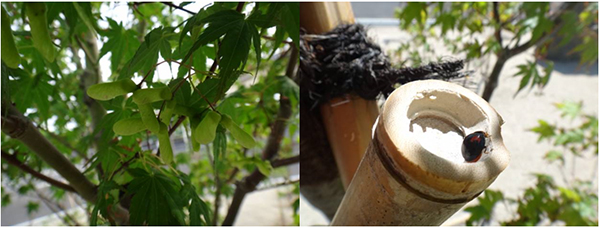 モミジがアブラムシに襲われていましたが、ちゃんとテントウムシ君が食べに来てくれました。 生態系ってよくできてますね~ 生物の成長やつながりって、よ~く観察するととてもおもしろいんです。