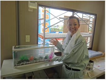 この写真は、現場近くの生き物を採取し、啓発のために現場事務所に水槽を設置したときの様子。