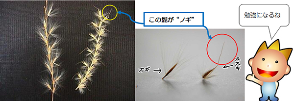 ススキには丸で囲った“ノギ”という髭が出ています。オギにはこの髭はありません。