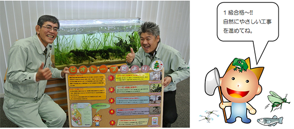 向かって左が“お魚大好きの朝日さん”、右が“生き物マニアの石浜さん”。 エコミーティングの活動に拍車がかかる事、間違いなしですね!! また、2級ビオトープ施工管理士も16名の方が合格し、 有資格者は、全社で65名となりました。 これからも全社員の取得を目指し、がんばっていきますよ。