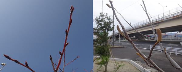 ウグイスカグラです。可憐な花ですね そのほかにも、ヤマザクラ(左)やコブシ(右)の花芽が出てきています。