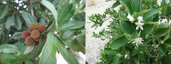 ヤマモモの実(左)が熟したり、金柑の花(右)が咲いたりしましたよ。