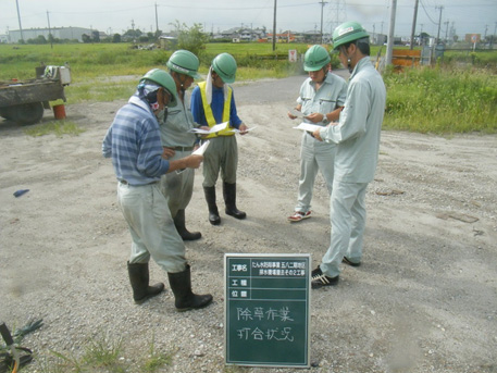 生き物を追い込まないように逃がしながら除草をするため、作業員さんと一緒に 除草の方向を決めます。