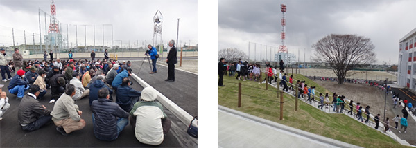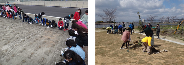 地域の人々と地元の小学生、大学生の方々が集まり、まずは芝を植え