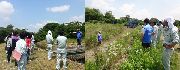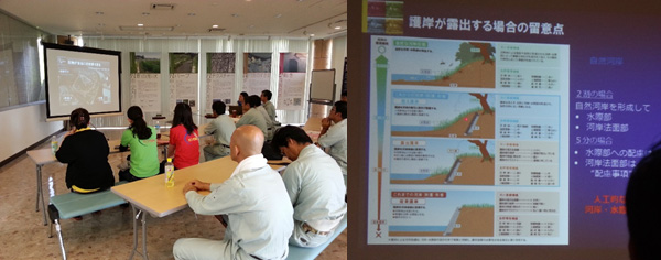 ここでは、護岸の植生実験や景観実験、濁水実験などの説明をしていただきました。