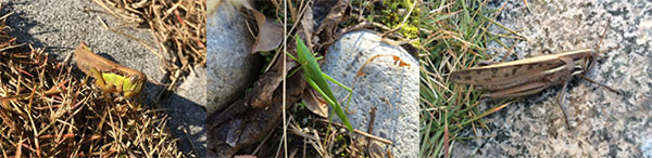 見にくいですが、常緑樹のヤマモモとクスノキ以外はほとんどの葉っぱが落ちてます。 まさに冬の到来です。でもそんな中にも生き物はいるんですね~。 左はコバネイナゴ、中央はクビキリギス、右はツチイナゴです。