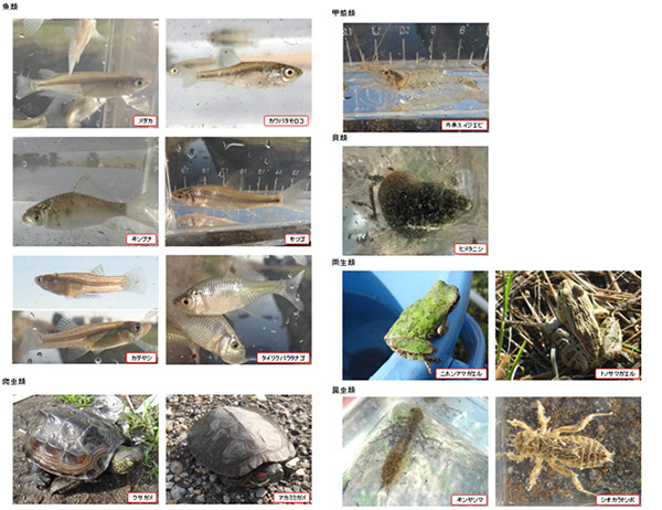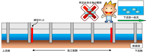 捕獲した生物の確認を行い、特定外来生物は駆除を、それ以外の生物は最下流側へ放流する。