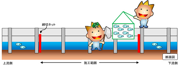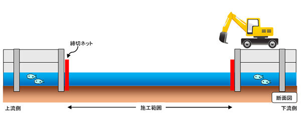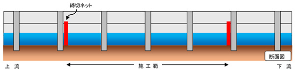 ネットにより、施工範囲の締切りを行う。水は流動できるものとし、ネットの目は魚の往来が出来ない大きさとする。