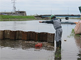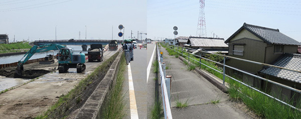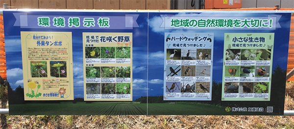 今は、機械の足場作りのために河川を矢板で締め切って盛土しています。 川のすぐ裏側は、民家がたくさんあります。 よくみると、民家より川の水位が高いんです。 だから、耐震補強は欠かせないんですね。 この現場では、色々な調査をしています。 植物や生き物・鳥の調査を実施してるんですよ。 それらの情報は、現場事務所の前に掲示してあります。 |