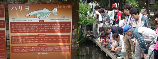 珍しい魚を前にカトケンの皆さん池の中のハリヨ見学に集中してます。