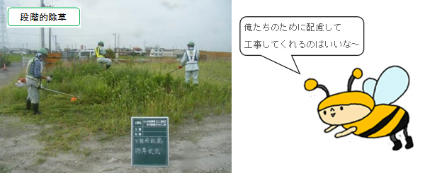 ②生態系に配慮した除草を実施する 現地の生きものに配慮した段階的な除草です。