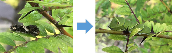 イヌザンショウにアゲハチョウの幼虫が…9月の終わりにはこんなに成長しましたよ。