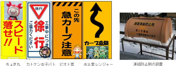 照明や電光掲示板、カーブマーカーの設置の他、凍結防止剤の設置やオリジナル安全看板など