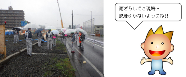 我らがエコミーティング軍団は、傘を差しながら、現場をイメージして考えます。