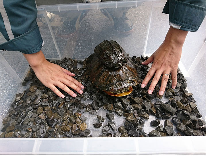 ミシシッピアカミミガメの上にクサガメを乗せてみました。