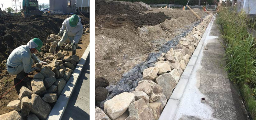 カトケンビオトープの施工が進み、敷地周囲の石積みが完了しました。