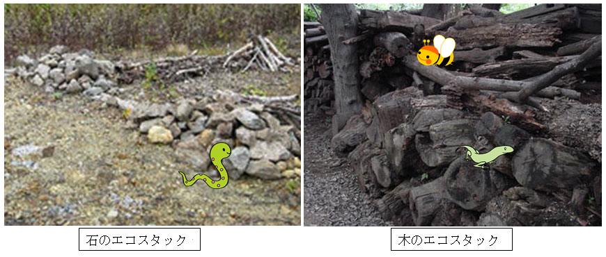 エコスタックとは石や木材を積んだもので、その隙間が生きものの住処となります。