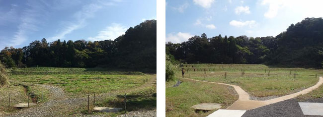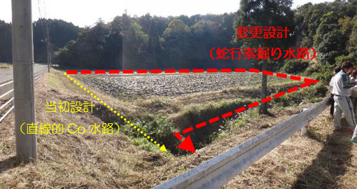 そこで、計画の変更を提案し、(右)赤線部の山側に沿って素掘りの水路が整備されました。