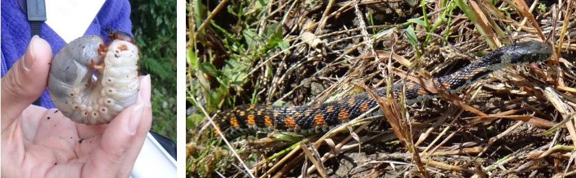 毎年恒例となりますが、(左)の写真はカブトムシの幼虫で、(右)の写真はヤマカガシです!