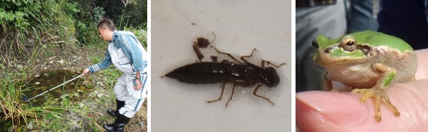 小さな池を調査してみると、トンボのヤゴや、エビ、カエルの仲間が見られました。