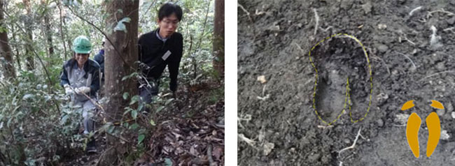 ポッカリと空いた、アナグマの巣や、(右)の写真はイノシシの足跡になります!!