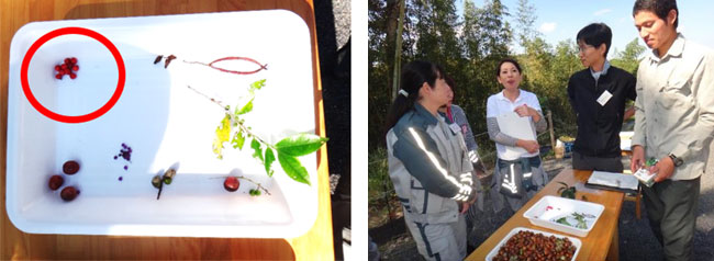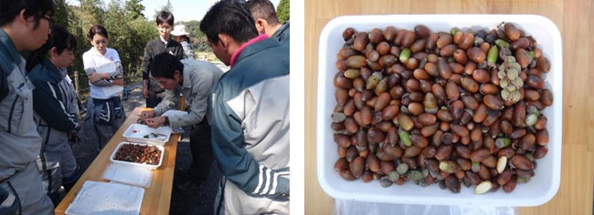研修二日目は、裏山に入り、自然の観察と種子採取を行いました。