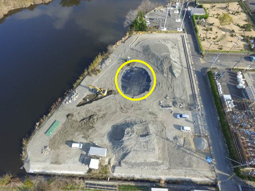 この丸で囲まれた部分は池となります。 なぜ黒いかというとゴムシートが敷かれているからなんです。 ですので、こんな感じでエコミーティング。